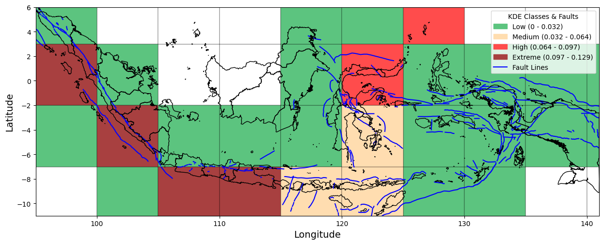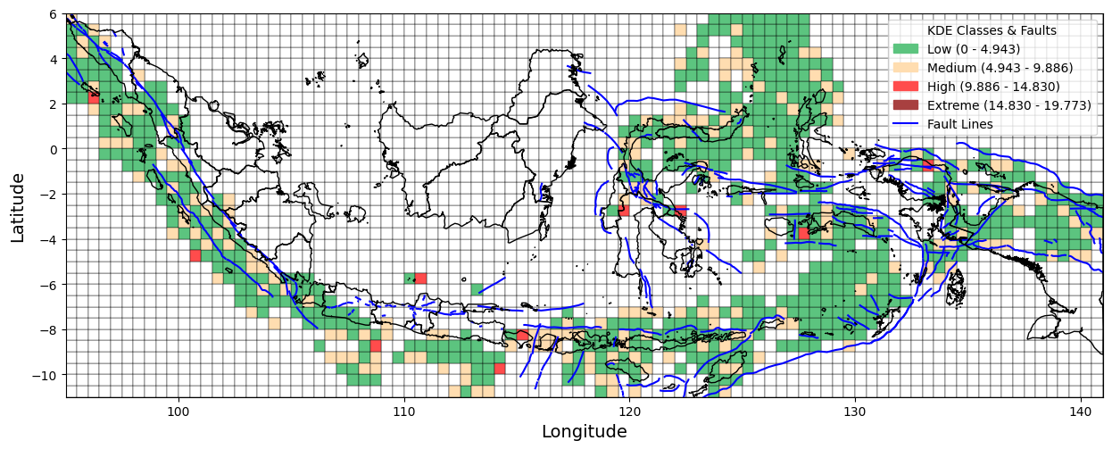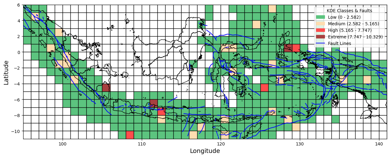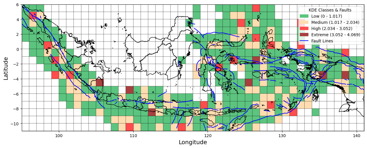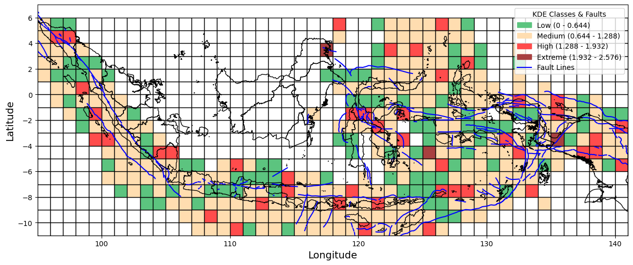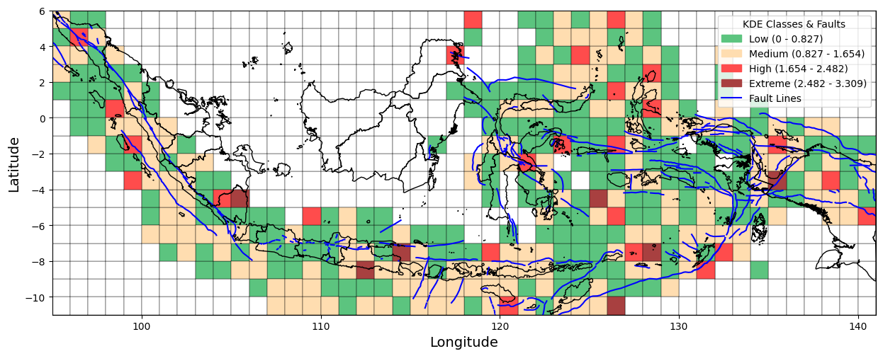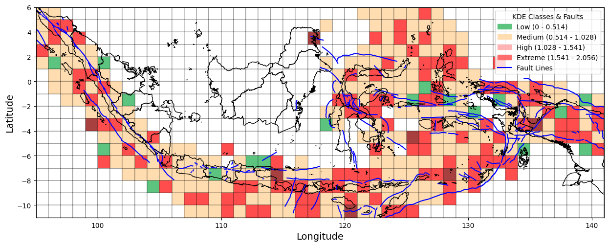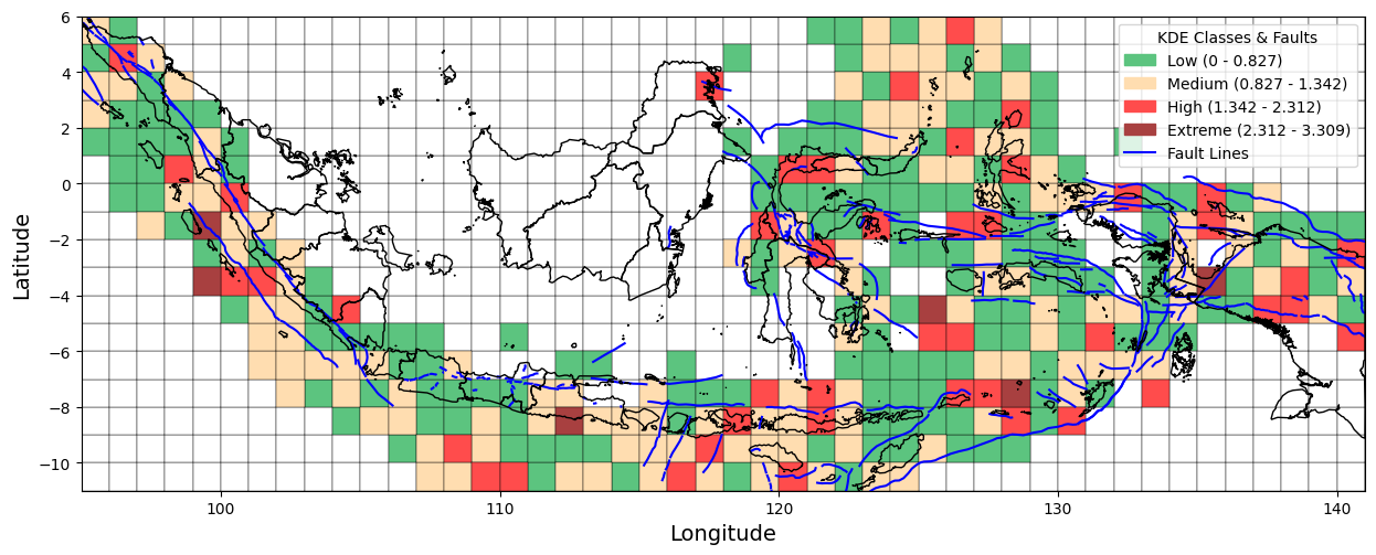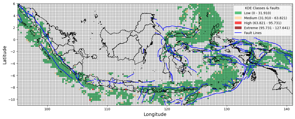 Figure 1 presents a visual overview of the research workflow, including data collection, preprocessing, spatial analysis using Kernel Density Estimation (KDE), and interpretation of seismic risk patterns. As part of this process, we collected earthquake incident data from 1964 to 2023 from the United States Geological Survey (USGS). We also created the Indonesian boundaries used in this study in GeoJSON format. In addition, active fault line data were obtained from the Pusat Studi Gempa Nasional (PuSGeN) in shapefile (SHP) format for spatial overlay and analysis. This study defines Indonesia's boundaries using the GeoJSON format. It incorporates fault line data from the Pusat Studi Gempa Nasional (PuSGeN) to map the spatial distribution of earthquake events, as shown in Figure 2. Kernel Density Estimation (KDE) was applied using variations in kernel functions, bandwidth sizes, and grid resolutions to generate more accurate seismic density maps. These variations were designed to assess their influence on the resulting spatial patterns of seismic hazard. The KDE-based approach facilitates the Identification of high-density earthquake zones, thereby offering clearer insights into regions potentially vulnerable to future seismic activity.
