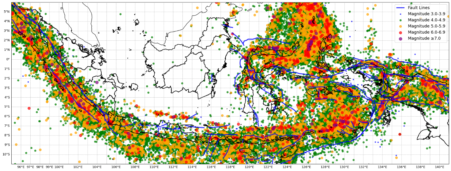 In addition, using this very long and detailed data allows researchers to conduct a comprehensive risk analysis. The density map of earthquake-prone areas generated from this data guides the formulation of more effective disaster mitigation policies. Understanding historical earthquake patterns enables more effective planning of preventive measures in vulnerable areas, aiming to minimize risks to Indonesia’s population and infrastructure.