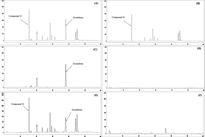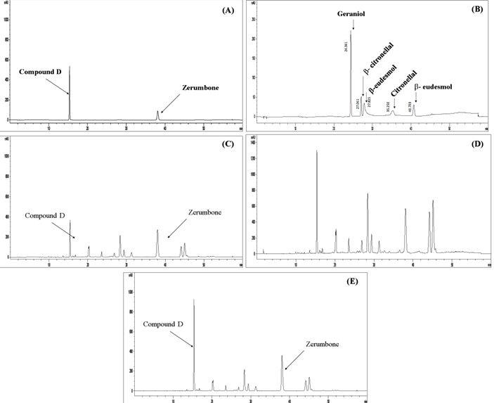 To confirm that the major compounds are the expected ones, Tri-Phon-That extract was spiked with compound D and zerumbone. After spiking, we observed that the two major peaks were higher when compared to the HPLC chromatogram of Tri-Phon-That extract, compound D, and zerumbone, as shown in Figure 6. The retention times were as follows: for compound D at 15.37 min, and zerumbone at 38.11 min. Geraniol, -citronellal, -eudesmol, and citronellal that have been reported to be found in C. nardus were injected to compare to the peaks in Tri-Phon-That extract. However, Tri-Phon-That extract was not found to have a similar peak to these standards, as shown in Figures 6B and 6D.