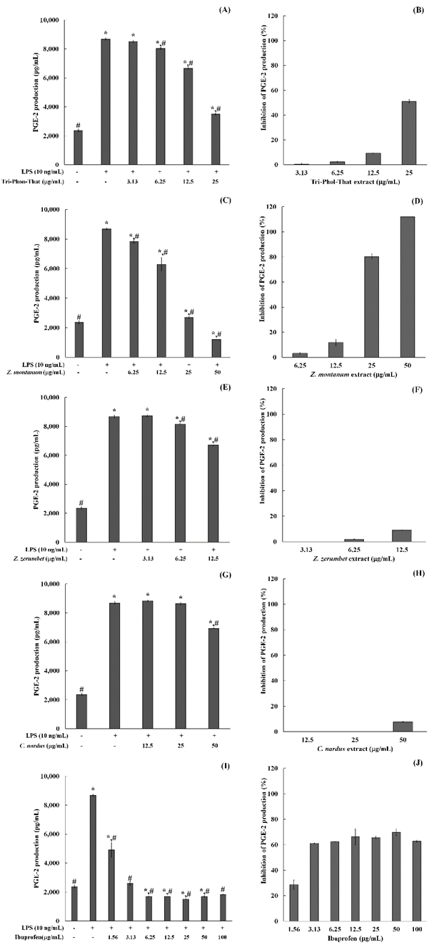 Figure 4 Effect of (A, B) Tri-Phon-That, (C, D) Z. montanum, (E, F) Z. zerumbet, (G, H) C. nardus extracts, and (I, J) ibuprofen on PGE-2 production. Error bars represent mean ± SD from three experiments. Group comparisons were performed using the ANOVA followed by Dunnett t-test for statistical analysis, with significance thresholds set at (*) p < 0.05 compared to the control or untreated group and (#) p < 0.05 compared to the LPS-treated group.