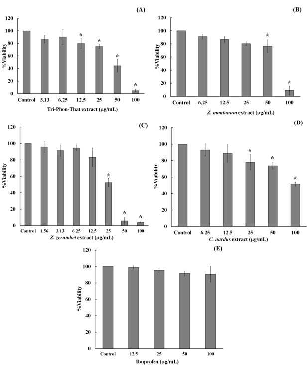 Figure 1 Effect of (A) Tri-Phon-That, (B) Z. montanum, (C) Z. zerumbet, (D) C. nardus extracts, and (E) ibuprofen on cell viability. Error bars represent mean ± SD from three experiments. Group comparisons were performed using the Kruskal-Walli’s test for statistical analysis, with significance thresholds set at (*) p < 0.05 compared with the control or untreated group.