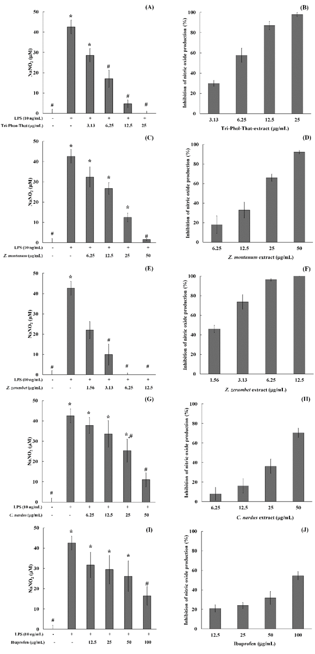 Figure 2 Effect of (A, B) Tri-Phon-That, (C, D) Z. montanum, (E, F) Z. zerumbet, (G, H) C. nardus extracts, and (I, J) ibuprofen on nitric oxide production. Error bars represent mean ± SD from three experiments. Group comparisons were performed using the Kruskal-Walli’s test for statistical analysis, with significance thresholds set at (*) p < 0.05 compared to the control or untreated group and (#) p < 0.05 compared to the LPS-treated group .