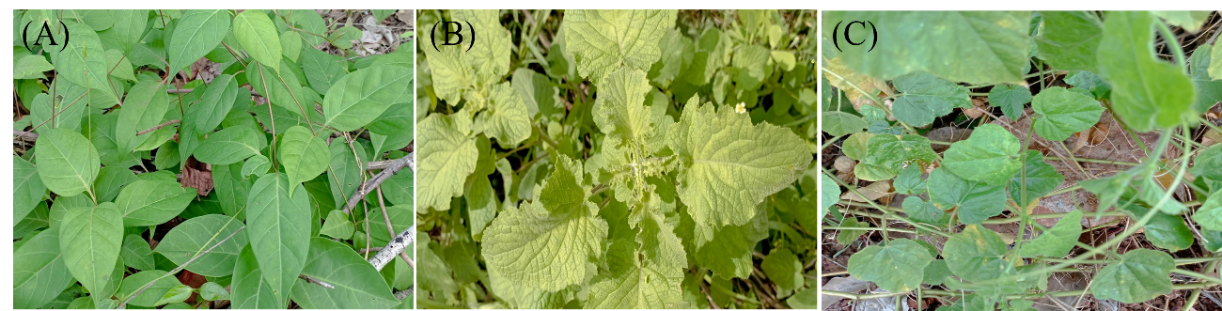 Figure 2 Leaf characteristics of (A) U. polymorpha, (B) H. suaveolens, and (C) P. foetida.