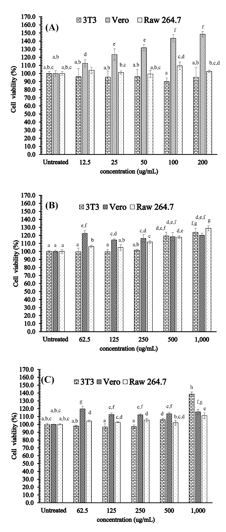 The cytotoxic activities of U. polymorpha, H. suaveolens, and P. foetida leaf extracts were appraised on RAW 264.7, Vero, and 3T3 cells using an MTT assay, with slight modifications from the methodology described by Preecharram et al. [10] and Situmeang et al. [16]. Briefly, each type of cell was cultured in a 96-well plate at a density of 104 cells per well and incubated at 37 °C in a 5 % CO2 atmosphere for 24 h. Following the incubation, the cells were treated with various concentrations of each crude extract (62.5, 125, 250, 500 and 1000 ug/mL) for another 24 h. After each treatment, the medium was replaced and 0.5 mg/mL of MTT was added to the wells. Then, the cells were incubated at 37 °C in a 5 % CO2 atmosphere for 1 h. Subsequently, the medium was removed, and the resulting formazan precipitate was dissolved in dimethyl sulfoxide. The absorbance of the dissolved formazan was measured at 570 nm using a microplate reader (PerkinElmer; En-Sight; USA). Cell viability was calculated by comparing the absorbance of the treated cells with that of control cells using Eq. (5).