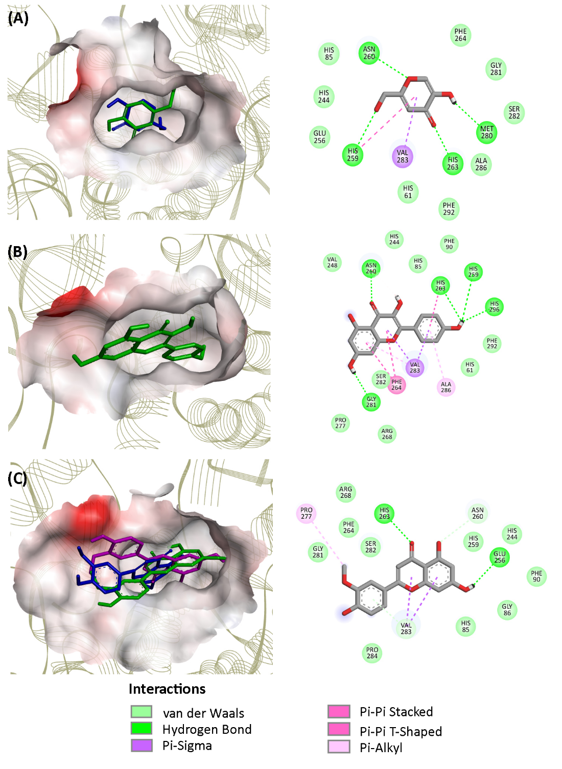 Kaempferol is a flavonoid consisting of 4 hydroxyl groups that may form hydrogen bonds, making the molecule too bulky to penetrate the active site effectively. The docked structure indicated that the phenyl group of the molecule reorients inward, forming hydrogen bonds with HIS259, HIS263, and HIS296, as seen in Figure 5(B). The docking results of chrysoeriol revealed 3 possible docked structures with slightly different orientations (Figure 5(C)). As can be seen in Table 6, chrysoeriol has comparable binding affinity to kaempferol, probably attributable to their similar structures. The orientation of chrysoeriol in the 3 docking conformations is contrary to that of kaempferol. The benzopyran moiety was oriented inward inside the deep cavity of the active site. This compound can form hydrogen bonds with amino acid residues, including GLU256, ASN260, HIS263, and VAL283.