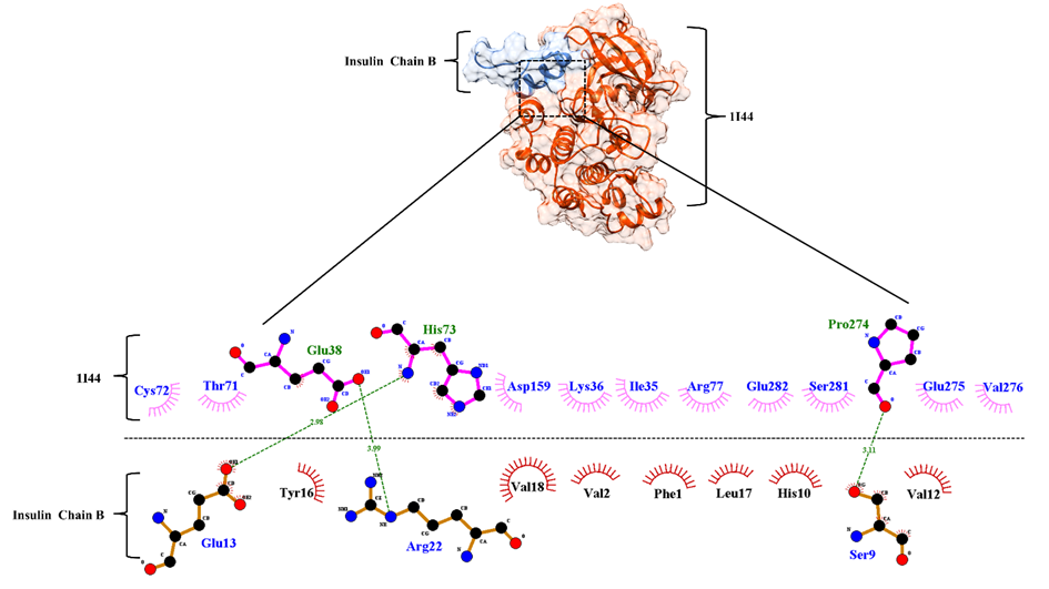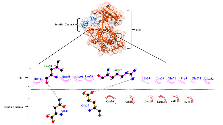Figure 3 Binding pose and interaction profile of insulin chain A with the insulin receptor tyrosine kinase (PDB ID: 1I44).