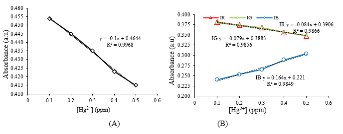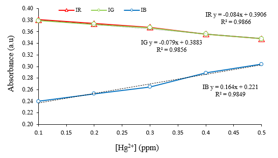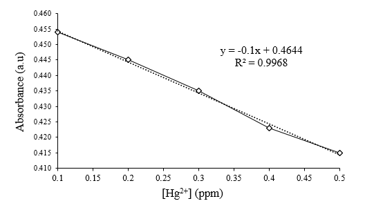Sensitivity was conducted to determine the detection capability and minimum concentration of Hg2+ that the AgNPs can detect. Sensitivity was evaluated by observing color changes in AgNPs mixed with standard Hg2+ solutions and comparing these with a blank solution (without Hg2+ addition) and through UV-Vis spectrophotometer analysis. Two mL of silver nanoparticle solution was placed in each vial and 1 mL of Hg2+ standard solution at concentrations of 0, 0.1, 0.2, 0.3, 0.4 and 0.5 ppm were added. Color changes were observed, and absorbance was measured using a UV-Vis spectrophotometer, with RGB values measured by the TCS3200 color sensor as the proposed method.