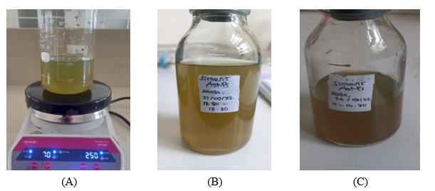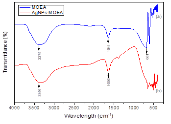 To synthesize silver nanoparticles (AgNPs), 20 mL of Moringa leaf ethyl acetate extract was mixed with 180 mL of 1 mM AgNO3 solution in a 250 mL volumetric flask. The mixture was heated to 70 C and stirred using a magnetic stirrer at 250 rpm for 90 min. The resulting color change to yellowish-brown indicated the formation of AgNPs. Absorbance was measured using a UV-Vis spectrophotometer in the 380 - 500 nm wavelength range. The synthesized AgNPs were characterized using FTIR and TEM [47,48].