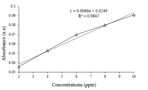 The quantitative assessment of TFC began with preparing a quercetin standard solution. A total of 25 mg of quercetin was weighed and dissolved in 25 mL of ethanol to create a 1,000 ppm quercetin stock solution. From this stock solution, 1 mL was pipetted and diluted with ethanol to a total volume of 10 mL, resulting in a 100-ppm quercetin standard solution. From this 100-ppm standard, a series of concentrations-2, 4, 6, 8 and 10 ppm-was prepared. Each concentration was taken as 1 mL and mixed with 3 mL of ethanol, 0.2 mL of AlCl3, 0.2 mL of 1 M potassium acetate, and 5.6 mL of distilled water. The solutions were then incubated for 30 min at room temperature, and their absorbance was measured using a UV-Vis spectrophotometer at a wavelength of 440 nm, with 3 repetitions. A calibration curve for the quercetin standard solution was constructed to obtain the linear regression equation.