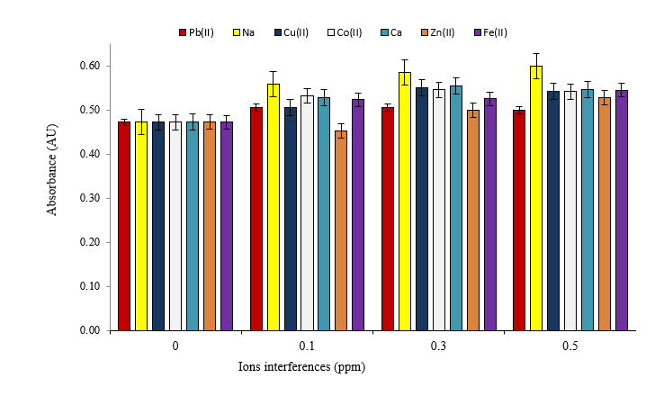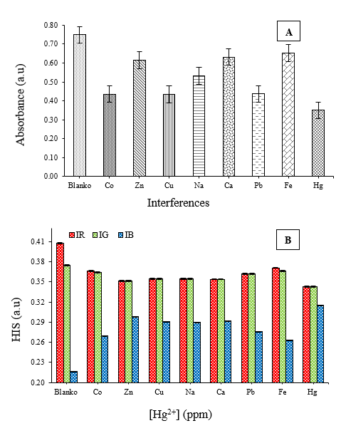 Specificity testing aims to evaluate the ability of a reagent to accurately and selectively measure a particular analyte in the presence of other potential components in a sample. Specificity was determined by adding 2 mL of AgNPs to each vial, followed by 1 mL of 0.5 ppm Hg2+ metal solution. Subsequently, standard metal solutions of Ca2+, Fe2+, Na+, Pb2+, Co2+, Cu2+ and Zn2+ concentrations of 0, 0.1, 0.3 and 0.5 ppm were added in volumes of 0.1 mL to each solution. Color changes were observed, and absorbance was measured using a UV-Vis spectrophotometer, with RGB values measured by the TCS3200 color sensor as the proposed method.
