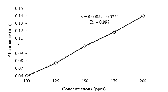 The TPC in the Moringa leaf extract was determined using the Folin-Ciocalteu method, with gallic acid as the standard. Absorbance values from varying concentrations of gallic acid were used to construct a calibration curve. The total phenolic content of the Moringa leaf extract was calculated using the regression equation derived from the calibration curve y = 0.0008x – 0.0224, with R2 = 0.997 as shown in Figure 2.