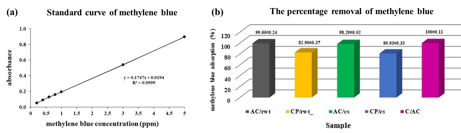 Figure 11(b) shows the XRD patterns of CP/rwt, CP/cs, AC/rwt, AC/cs, and C/AC samples. The results indicated that all samples primarily exhibited an amorphous solid structure. However, slight peaks indicating the presence of crystalline solids were also observed in all samples. These crystalline structures might have developed during the carbonization and chemical activation procedures, which required heating for 2 h at temperatures between 600 and 800 °C using an innovative simple biomass incinerator. This heating process may cause the amorphous carbon structure to change, leading to the formation of graphite carbon crystals, with a peak observed at approximately 2θ = 26.37 ° (XRD patterns of JCPDS 41-1487) [14,25,41-43]. Additionally, peaks corresponding to alkaline metals, which could be impurities or components of the starting materials, were found at 2θ positions of approximately 43.98, 49.05, 64.40, and 77.40 ° (XRD patterns of JCPDS 04-013-4058, JCPDS 04-0829, JCPDS 04-0835, and JCPDS 01-070-0392). The presence of these peaks in small amounts is consistent with the EDS data from the elemental analysis of the samples. Calcium, magnesium, sodium, and silicon are found in all parts of plants as a result of mineral accumulation. The amount of nutrients that plants absorb may vary depending on the mineral content of the soil in each area [44-46]. Consequently, the activated carbon obtained is primarily composed of disorganized amorphous carbon with widespread pores. These chemical structures and various properties are the hallmarks of the activated carbon obtained from this research in its application as an adsorbent, demonstrating high adsorption efficiency comparable to commercial activated carbon.