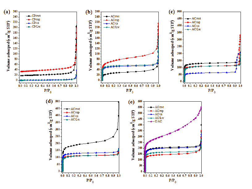 Identifying the pore structure of activated carbon is crucial prior to designing its applications. The Brunauer-Emmett Teller (BET) method serves as a fundamental approach to calculate the specific surface area of activated carbon based on its isotherms. Inert gas adsorption, commonly utilizing nitrogen (N2), is favored due to its ability to reveal scientific insights into the textural characteristics of activated carbon. Figure 5, displays the N2 adsorption isotherms obtained at 77 K for all synthesized carbonized carbon and activated carbon which prepared using various methods and activation temperatures. Additionally, Table 1 presented the results of the analysis of BET surface area, pore volume, and average pore diameter. The experimental results indicated that the N2 gas adsorption isotherm of carbonized carbon samples typically exhibited the lowest nitrogen gas adsorption values, as illustrated in Figure 5(a). However, samples subjected to activation, including those activated via a 1-step process (Figure 5(b)), a 2-step process with bulk wet activation (Figure 5(c)), a 2-step process with wet powder activation (Figure 5(d)), and a 2-step process with dry powder activation (Figure 5(e)), generally showed an increased N2 gas adsorption isotherm. Moreover, activated carbon produced through the 2-step process with dry powder activation tends to display the highest nitrogen gas adsorption isotherm among the tested materials.