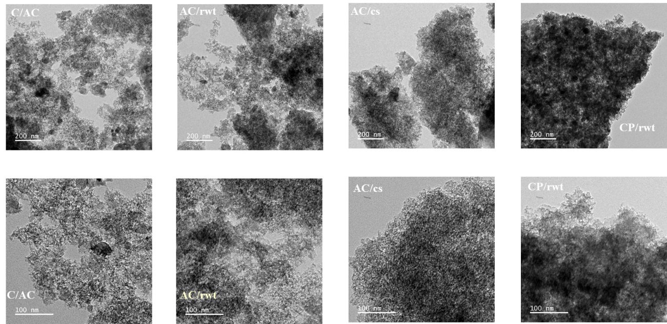 The activated carbon samples derived from agricultural waste and prepared by various methods were thoroughly characterized using multiple analytical techniques. X-ray diffraction (XRD) analysis was conducted using an X’Pert Pro MPD model manufactured by PANalytical (Malvern Panalytical), Netherlands; however, the analysis itself was performed locally in Thailand. The XRD was operated under the following conditions: Cu Kα radiation (λ = 1.5406 Å), operating voltage of 40 kV, current of 30 mA, and a scanning range of 20 to 80 ° (2θ) at a step size of 0.02 °. Surface area and porosity analyses were carried out using the BET-sorp mini II, manufactured by BEL, Japan, with nitrogen adsorption-desorption at 77 K. The specific surface area was calculated using the BET method, and pore volume and size distribution were determined using the Barrett-Joyner-Halenda (BJH) method. Transmission Electron Microscopy with Energy Dispersive X-ray Spectroscopy (TEM-EDS) was performed using a TECNAI G2 20 model by FEI, Netherlands, operated at an accelerating voltage of 200 kV, to examine the internal morphology and elemental composition of the activated carbon.