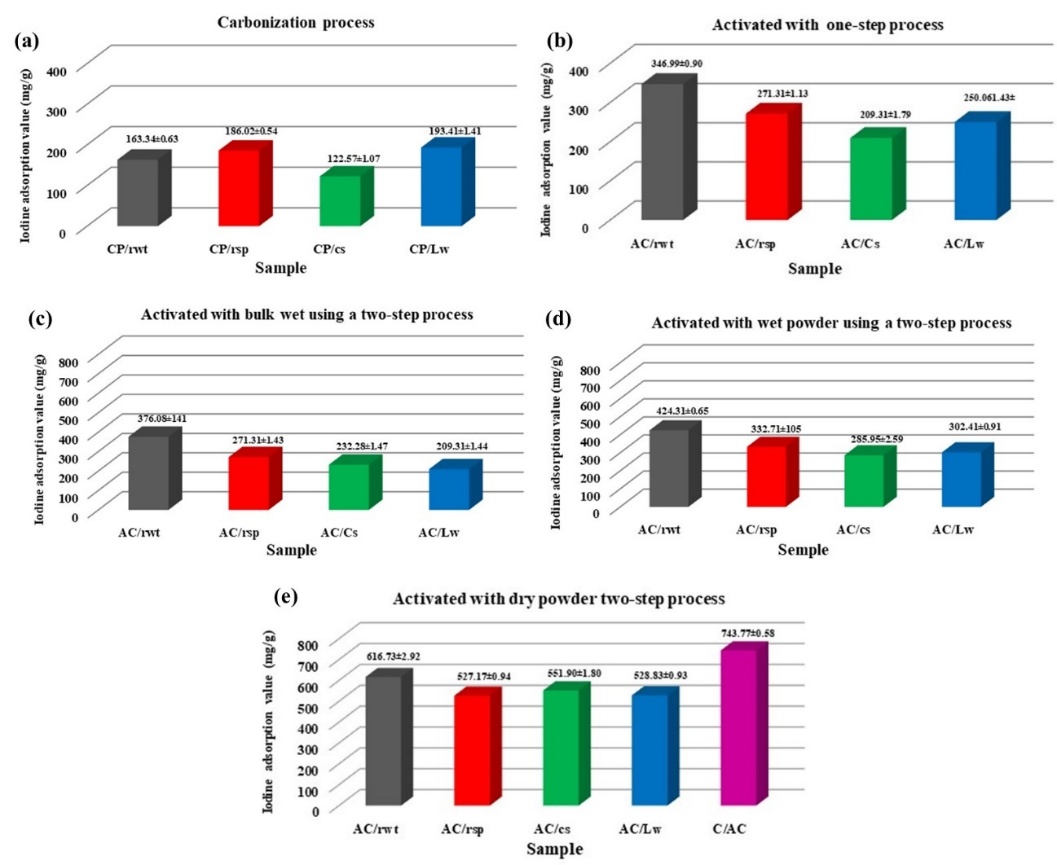 Figure 3 Iodine adsorption values (mg I₂/g sample) of (a) carbonization process samples (CP/rwt for rubber wood twigs, CP/rsp for rubber seed pods, CP/Lw for Leucaena wood, and CP/cs for coconut shells) and (b) samples activated using a 1-step process; (c) activated with bulk wet using a 2-step process, (d) activated with wet powder using a 2-step process, and (e) activated with dry powder using a 2-step process, when AC/rwt for rubber wood twigs, AC/rsp for rubber seed pods, AC/Lw for Leucaena wood, and AC/cs for coconut shells).