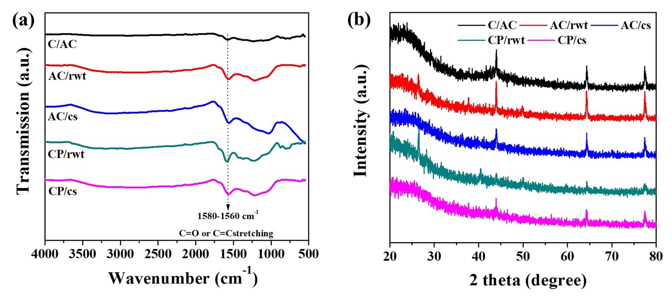 Figure 11(a) displays the findings of the identification study that combined chemical analysis and the Fourier transform infrared (FT-IR) functional group analysis technique. The FT-IR spectra of samples CP/rwt, CP/cs, AC/rwt, AC/cs, and C/AC showed similar vibrational characteristics of functional groups. All of the samples’ spectra revealed bond vibrations that might correspond to C=C functional groups (aromatic compounds) at wavenumbers around 1580 - 1560 cm⁻¹, while the vibrations of other types of functional groups were not evident. This is because the raw carbon samples CP/rwt and CP/cs, as well as the activated carbon samples AC/rwt, AC/cs, and C/AC, primarily consist of carbon, which forms strong bonds between carbon atoms. As a result, the functional groups of various types of organic compounds are not clearly visible. However, the C=C functional groups may arise from organic substances present in the starting materials such as cellulose and lignin compounds which may leave some residues during the combustion process and are found in only small amounts. The study’s findings concurred with those published by Foo and Hameed [39], Pouretedal and Sadegh [40], Mistar et al. [10], Dao et al. [25], and Roschat et al. [14]. These studies analyzed the chemical structure of the functional groups in activated carbon samples using FT-IR. They found that the functional groups present varied depending on the raw materials and preparation methods used for the activated carbon samples. Most of the functional groups identified in organic compounds from plants include O H stretching vibrations of hydroxyl groups, C H stretching vibrations in methylene and methyl groups, C=C stretching vibrations of alkene, and C=O stretching vibrations of carboxyl, lactone, aldehyde, and ketone groups. These functional groups were found to correspond to the main chemical components of plants including cellulose, hemicellulose, and lignin.