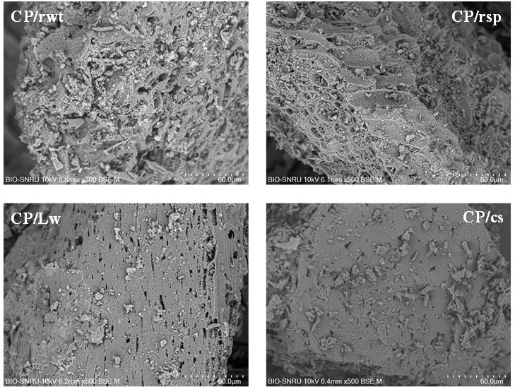 Scanning Electron Microscopy (SEM) was conducted using a QUANTA 450 model by FEI, France, at an accelerating voltage of 10 kV under high vacuum conditions to observe surface morphology at a magnification of 500-fold. The analysis was performed in Back Scattered Electron (BSE) mode to enhance contrast and provide detailed information on the composition and structure of the samples. Fourier Transform Infrared (FT-IR) spectroscopy analysis was performed using a SHIMADZU FT-IR-8900, made in Japan, with a spectral range of 500 - 4000 cm⁻¹ with a resolution of 4 cm⁻¹ and 32 scans per sample. To evaluate adsorption efficiency, iodine number determination was carried out according to TIS 900 - 2004, as established by the Ministry of Industry of Thailand [1,4,13], and methylene blue adsorption capacity was measured using methods adapted from Pathania et al. [22]. The efficiency of dye adsorption was reported in terms of the percentage removal of methylene blue, calculated by the difference between the initial concentration of methylene blue and the residual concentration of methylene blue. The calculated difference was then divided by the initial concentration of methylene blue and expressed as the percentage of methylene blue removal. The final methylene blue concentration was determined by spectrophotometry at 665 nm wavelength using the calibration curve. All adsorption experiments were performed in triplicate, and results were reported as mean values with deviations within ± 3 %.