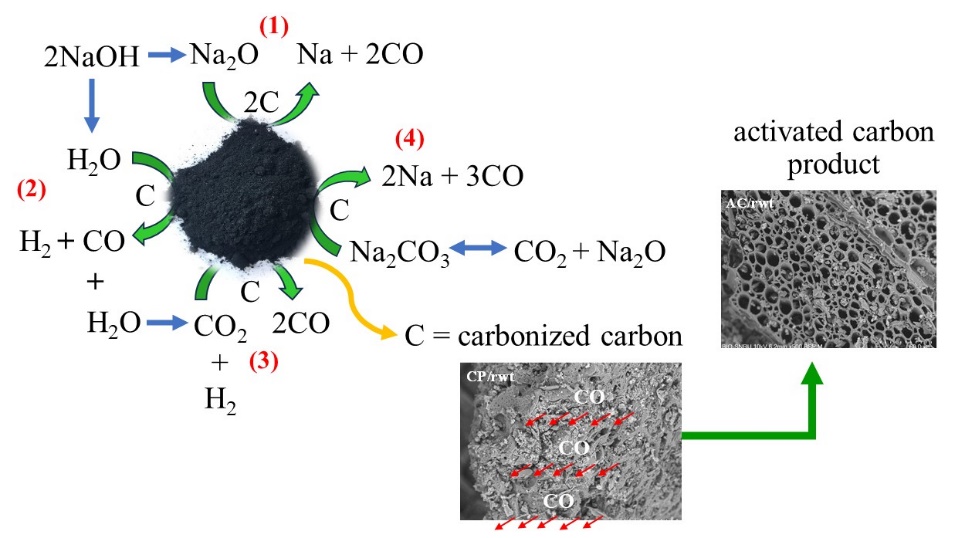 Figure 4 Infographic illustrating the proposed reaction mechanism for pore formation in carbonized carbon when activated with NaOH as the activating reagent.