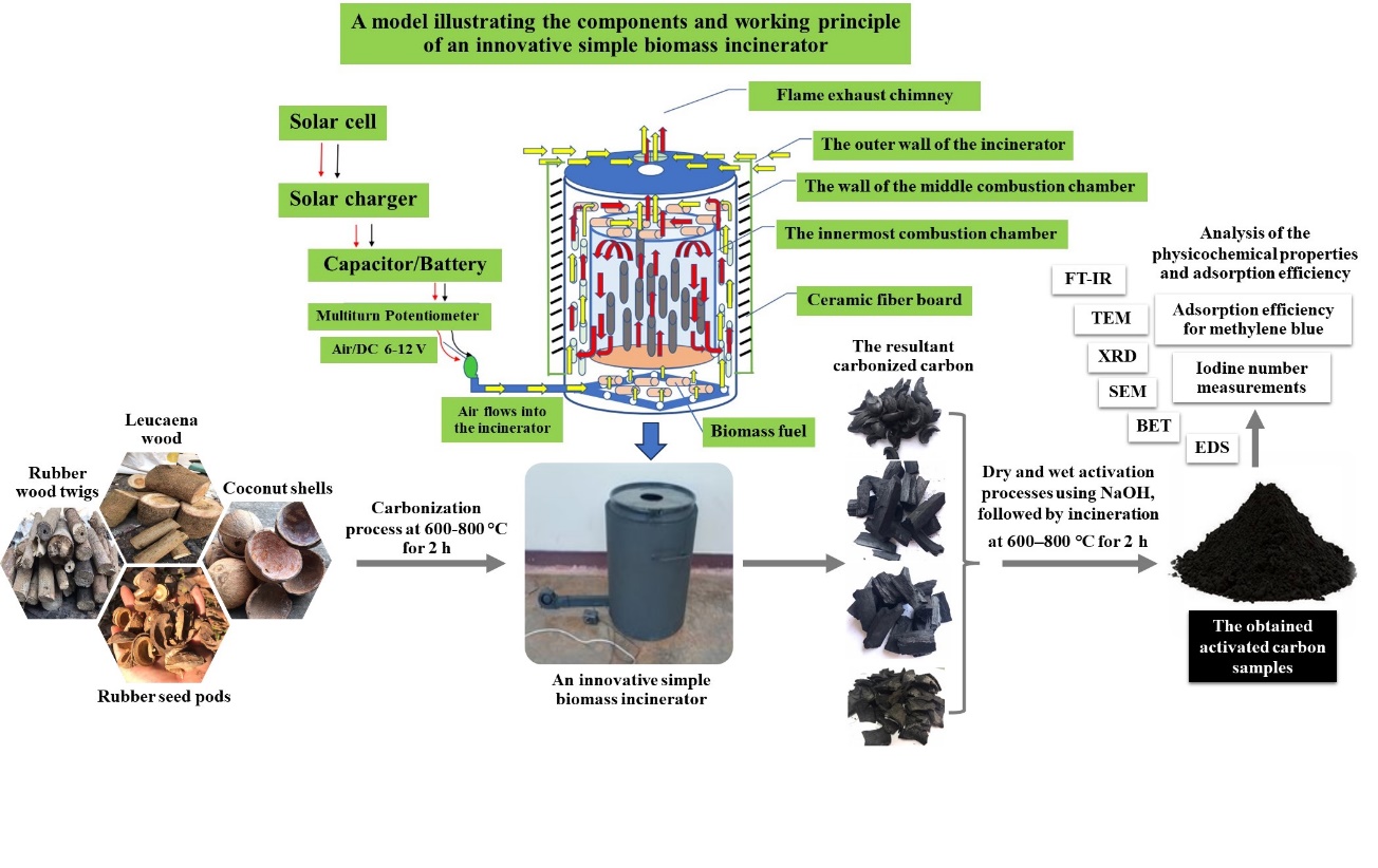 Despite the extensive research on activated carbon derived from various biomass sources—such as Bambusa vulgaris Schrad., coconut shells, oil palm empty fruit bunches, desiccated coconut residue, rice husks, and even waste tires—there remains a critical gap in the utilization of locally abundant and underutilized agricultural residues. Many existing methods require high temperatures, multi-step procedures, or costly chemical modifications, which may limit their practical application, especially in rural areas. Furthermore, few studies have systematically compared different types of agricultural waste using a consistent activation method that is accessible, energy-efficient, and suitable for community-level implementation. Therefore, this research aims to address this gap by synthesizing activated carbon from agricultural residues specific to Sakon Nakhon Province, Thailand, including rubber wood twigs, rubber seed pods, Leucaena leucocephala wood, and coconut shells. These materials are locally available yet often discarded as waste, representing an untapped resource for value-added applications. An inventive biomass incinerator developed by the Appropriate Technology Center of Sakon Nakhon Rajabhat University was employed for the carbonization process. This prototype incinerator was specifically designed for efficient carbonization of agricultural biomass and featured a controlled air-flow system, high thermal insulation, and uniform heat distribution. Its design allowed for consistent temperatures necessary for producing high-quality charcoal while minimizing incomplete combustion and emissions, as shown in the details of its components and working principle in Figure 1 [13,14]. The choice of this incinerator is based on its suitability for small-scale, community-based applications and its ability to convert various types of agricultural waste—such as rubber wood twigs, rubber seed pods, Leucaena leucocephala wood, and coconut shells—into carbonized material with enhanced yield and quality. These features make it particularly well-aligned with the goals of this study, which seeks to transform local biomass waste into value-added activated carbon.