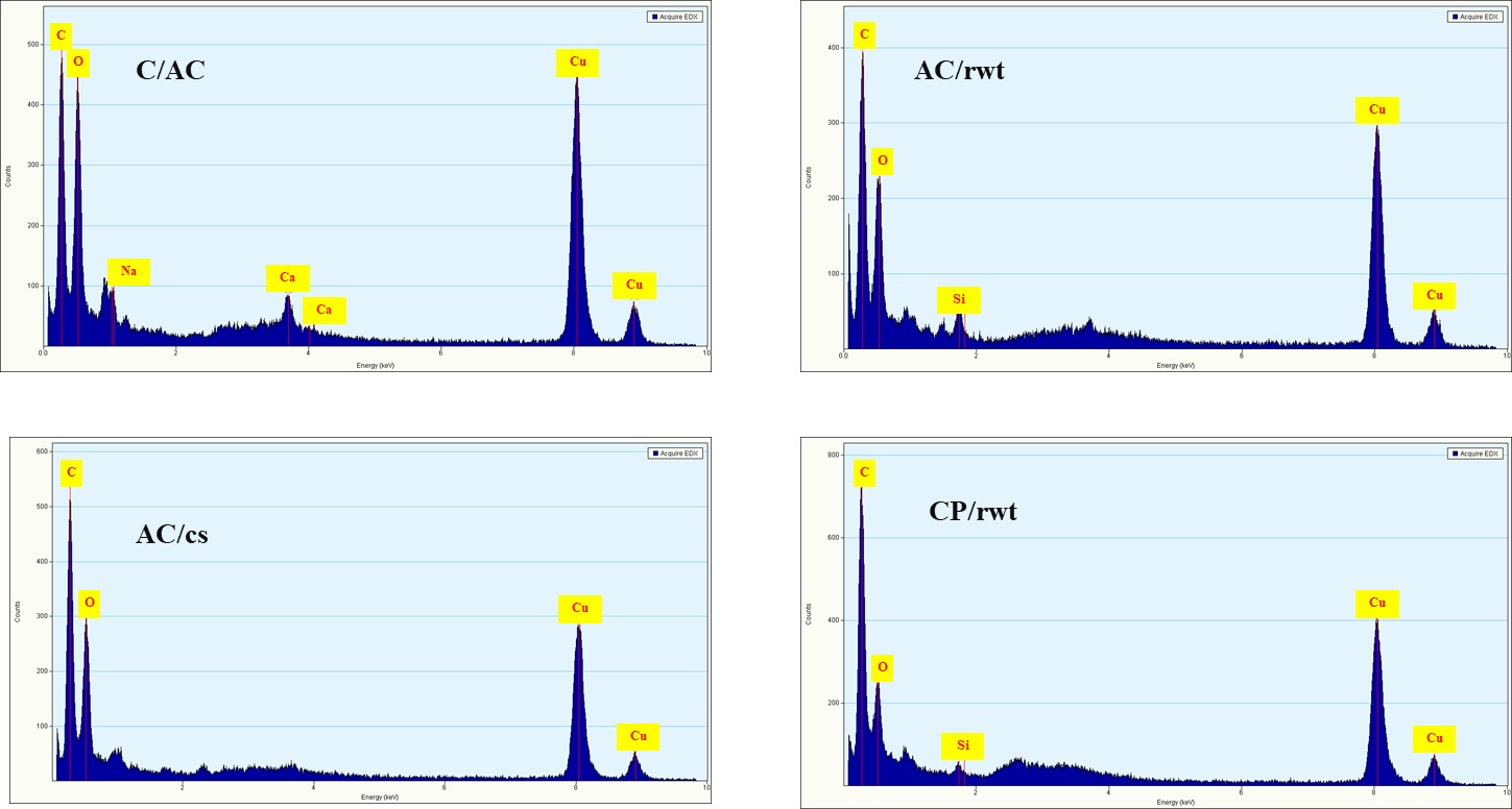 Figure 10 The EDS data for elemental analysis of the commercial activated carbon (C/AC) compared with the samples derived from the activated with dry powder 2-step process from rubber wood twigs (AC/rwt) and coconut shells (AC/cs), and the samples derived from the carbonization process derived from the rubber wood twigs (CP/rwt).