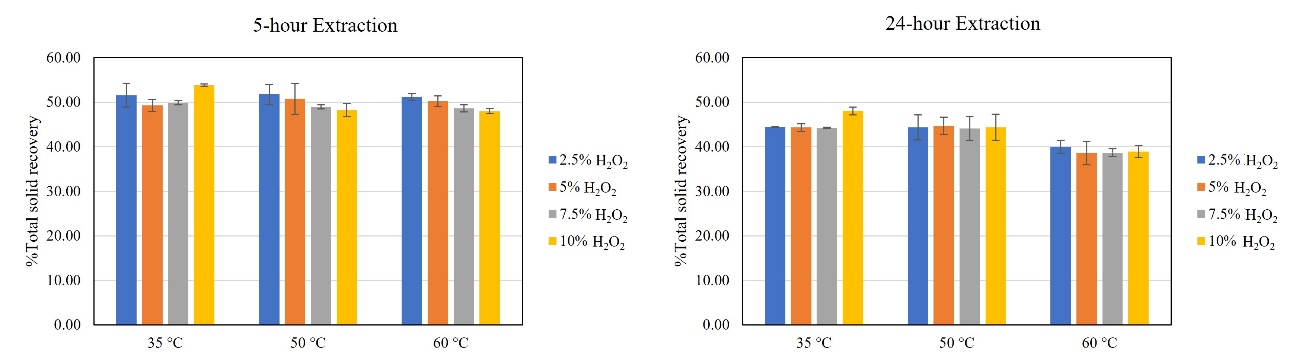 Figure 1 Comparison of total solid recovery in durian rind samples after extraction with 5 % NaOH in different concentrations of H2O2 at elevated temperatures for 5 and 24 h.