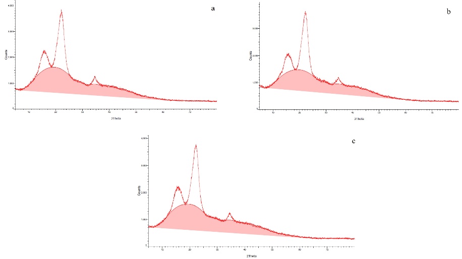 Figure 6 XRD chromatograms of cellulose with particle sizes (a) < 250 µm, (b) 250 - 425 µm, and (c) > 425 µm.