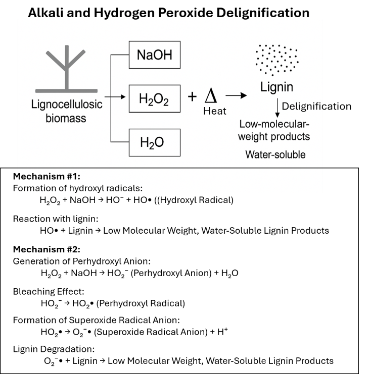 Figure 3 Schematic diagram illustrating the delignification mechanism during a single-step alkali and hydrogen peroxide pretreatment of lignocellulosic biomass.