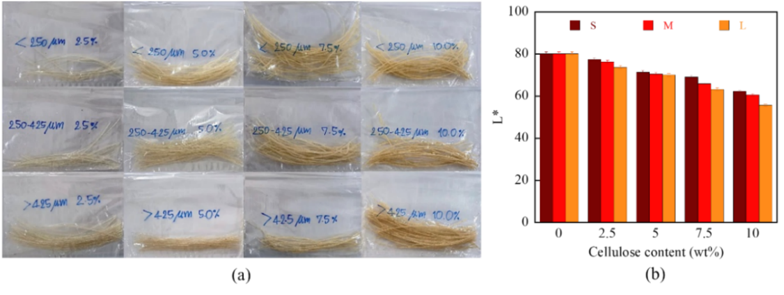 An extrusion-grade PLA (Ingeo™ Biopolymer 2003D, NatureWorks LLC) was employed as the polymer matrix, with a melting temperature of 190 °C and a density of 1.32 g/cm3. Cellulose in 3 particle size categories: Less than 250 µm (S), 250 - 425 µm (M), and greater than 425 µm (L) was used as additives. Each size fraction of cellulose particles was subsequently mixed with biodegradable PLA in concentrations ranging from 2.5 to 10 wt%.