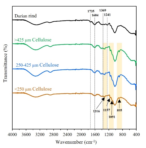 Cellulose was isolated from durian rind samples under the optimal condition (5 % NaOH in 7.5 % H2O2, 50 °C, 5 h). The extracted cellulose was subsequently oven-dried, ground, and sieved to obtain 3 different particle size ranges: < 250 µm, 250 - 425 µm, and > 425 µm. Fourier-transform infrared (FTIR) spectroscopy and additional analyses to characterize their properties.