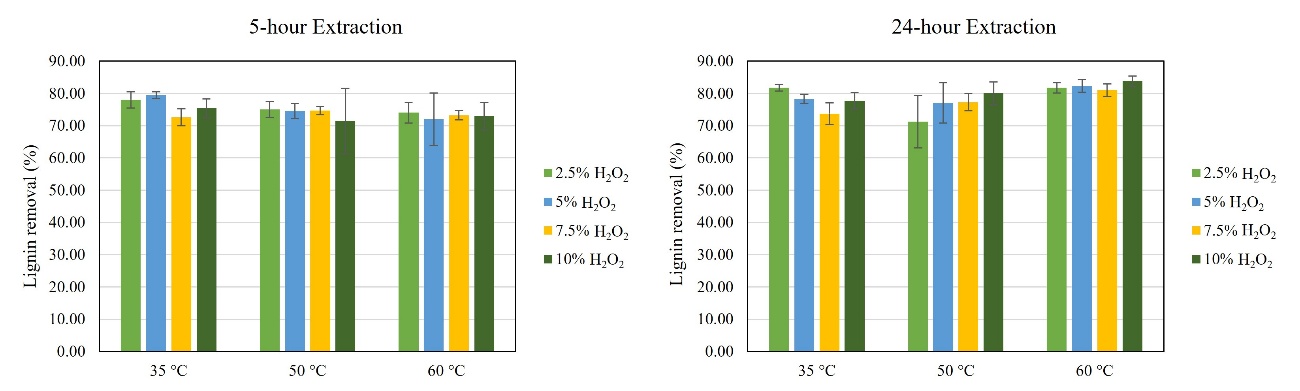 Figure 2 Comparison of lignin removal from durian rind samples after extraction with 5 % NaOH in different concentrations of H2O2 at elevated temperatures for 5 and 24 h.