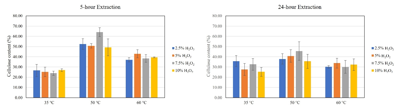 Regarding cellulose content in the extracted solids, a longer residence time was required to achieve higher cellulose content at the lower treatment temperature (35 °C), regardless of the H2O2 concentration. However, at a higher temperature (60 °C), prolonged residence time resulted in cellulose loss across all H2O2 concentrations, as evidenced by lower cellulose content compared to samples treated at 50 °C. Notably, the highest lignin removal was also observed at 60 °C for all H2O2 concentrations, suggesting that both cellulose and lignin were significantly degraded at this elevated temperature and extended treatment duration. This finding aligns with observations by Suriyatem et al. [33], who reported that using high concentrations of H2O2 (up to 40 %, v/v) at 80 °C for 2 h led to a reduction in cellulose yield. The loss of cellulose was likely due to depolymerization of the cellulose macromolecules into shorter chains, which subsequently became solubilized in the liquid phase.