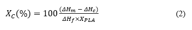 where Hm is the enthalpy of melting obtained from the area under the melting peak. Hc is the enthalpy of crystallization obtained from the area under crystallization peak, and XPLA is the weight fraction of PLA. Hf is the heat of fusion, defined as the melting enthalpy of 100 % crystalline PLA, which was previously reported to be 93 J/g [25-27].