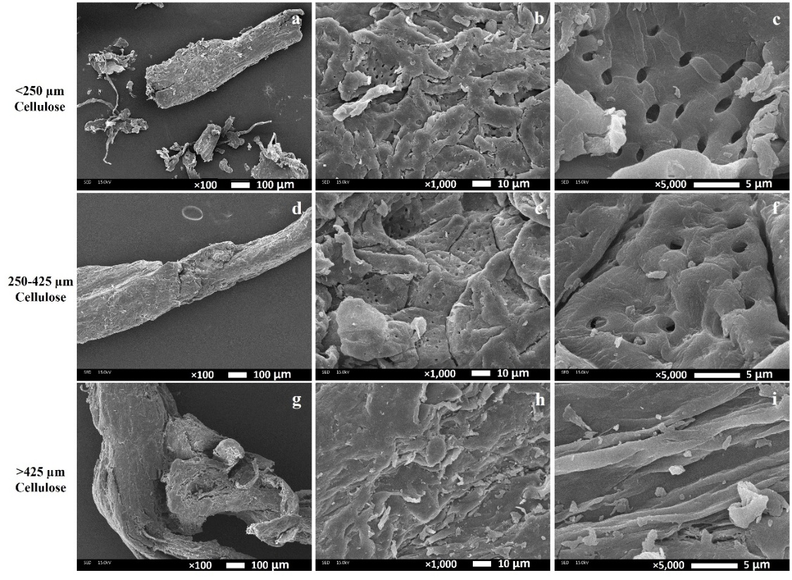 Cellulose isolated under the optimal condition was used to reduce particle sizes. Various particle sizes of cellulose, including < 250 µm, 250 - 425 µm, and > 425 µm were prepared by milling the extracted cellulose with a milling machine (Retsch, Model: ZM 200, Haan, Germany). The milled cellulose was passed through a series of sieves with different mesh sizes: 40 mesh (on the top), 60 mesh (in the middle), and a receiving pan (on the bottom), all mounted on a sieving machine (Fritsch, Idar-Oberstein, Germany). Particles retained on the 40-mesh were used as the > 425 µm sample, while particles retained on the 60 mesh were used as the 250 - 425 µm sample. Particles that passed through the 60-mesh sieve and collected in the receiving pan were used as the < 250 µm sample.