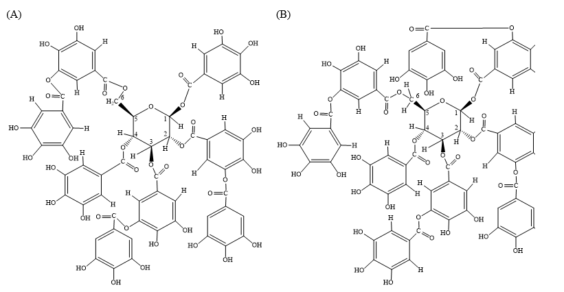 Figure 1 Chemical structure of octagalloyl-glucose (A) and nonagalloyl-glucose (B) hydrolyzable tannins.