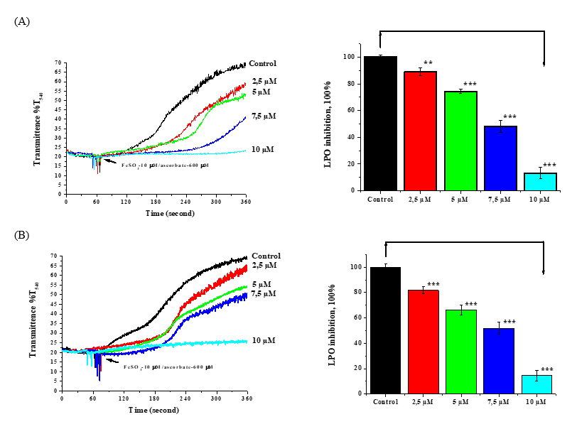 Figure 2 Effects of octagalloyl-glucose (A) and nonagalloyl-glucose (B) tannins on Fe2+/ascorbate-stimulated mitochondrial LPO process (*−p < 0.05; **−p < 0.01, ***−p < 0.001; n = 5). (Left hand-side is original recording and right hand-side is graphic).