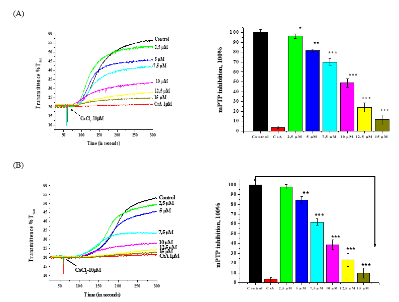 Figure 4 Effects of different concentrations of octagalloyl-glucose (A) and nonagalloyl-glucose (B) tannins on rat liver mitochondria on Ca2+-dependent mPTP. Ca2+-dependent high-amplitude contraction of mitochondria and complete inhibition of mPTP by CsA (5 μM) (* −p < 0.05, ** −p < 0.01, *** −p < 0.001; n = 5). (Left hand-side is original recording and right hand-side is graphic).