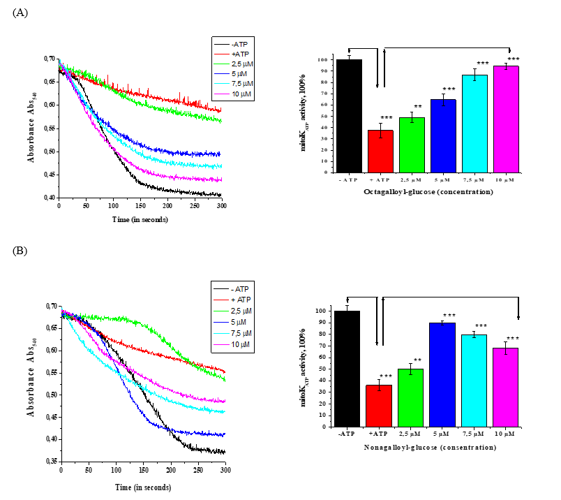 Octagalloyl-glucose was found to have an activating effect on the mitoKATP channel, increasing its activity up to 94.7 ± 2.5% at a concentration of 10 µM compared to the control (−ATP). Nonagalloyl-glucose exhibited a dome-shaped activation pattern within the 2.5 - 10.0 µM concentration range, reaching 84.2 ± 1.8% activation at 5 µM compared to the ATP-inhibited state. However, at 10 µM, the activation decreased to 50.5 ± 5.3%.