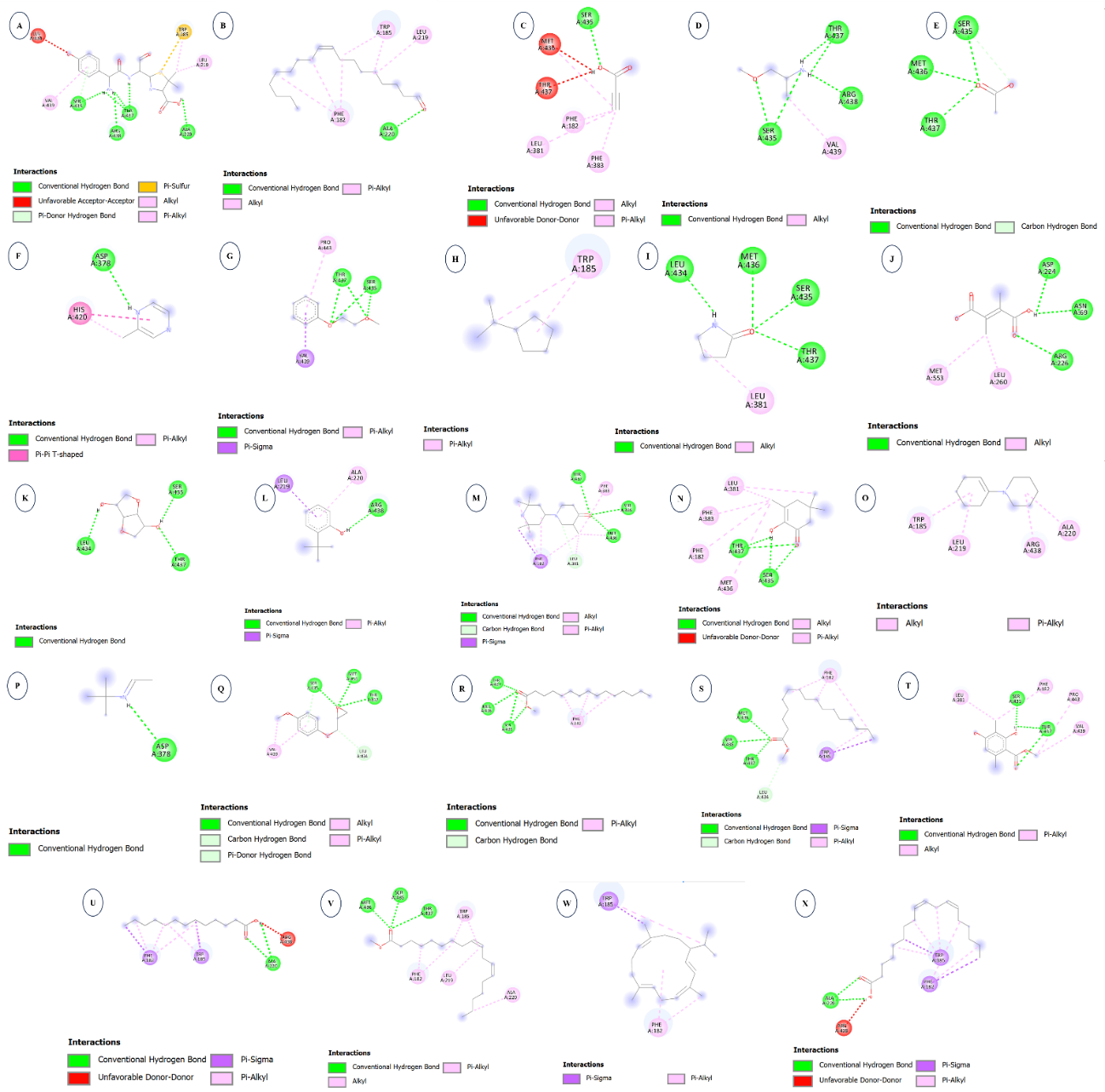 Figure 4 2D interactions of 2-{1-[2-Amino-2-(4-hydroxy-phenyl)-acetylamino]-2-oxo-ethyl}-5,5-dimethyl-thiazolidine-4-carboxylic acid (Control) and bioactive compounds from Coccocarpia erythroxyli (Spreng.) Swinscow & Krog against the 6IE1 protein. (A) 2-{1-[2-Amino-2-(4-hydroxy-phenyl)-acetylamino]-2-oxo-ethyl}-5,5-dimethyl-thiazolidine-4-carboxylic acid; (B) 9-octadecenal, (z)-; (C) Propiolic acid; (D) 2-Propanamine, 1-methoxy-; (E) Ammonium acetate; (F) Pyrazine, methyl-; (G) Benzene, (2-methoxyethoxy)-; (H) Cyclopentane, (1-methylethyl)-; (I) 2-pyrrolidinone; (J) 2,3-Dihydro-3,5-dihydroxy-6-methyl-4H-pyran-4-on; (K) Isosorbide; (L) Phenol, 2-(1,1-dimethylethyl)-; (M) Piperidin-4-one, 3-methyl-1-(2,2,6,6-tetramethyl-4-piperidyl)-; (N) 2-hydroxy-3,5,5-trimethyl-2-cyclohexenone; (O) Piperidine, 1-(1-cyclohexen-1-yl)-; (P) Ethanimine, N-t-butyl-; (Q) P-Methoxyphenyl glycidyl ether; (R) Pentadecanoic acid, methyl ester; (S) Hexadecanoic acid, methyl ester; (T) Benzoic acid, 2,4-dihydroxy-3,6-dimethyl-, methyl ester; (U) Tridecanoic acid; (V) 9,12-Octadecadienoic acid (Z,Z)-, methyl ester; (W) Cembrene; dan (X) 9,12-Octadecadienoic acid (Z,Z)-.