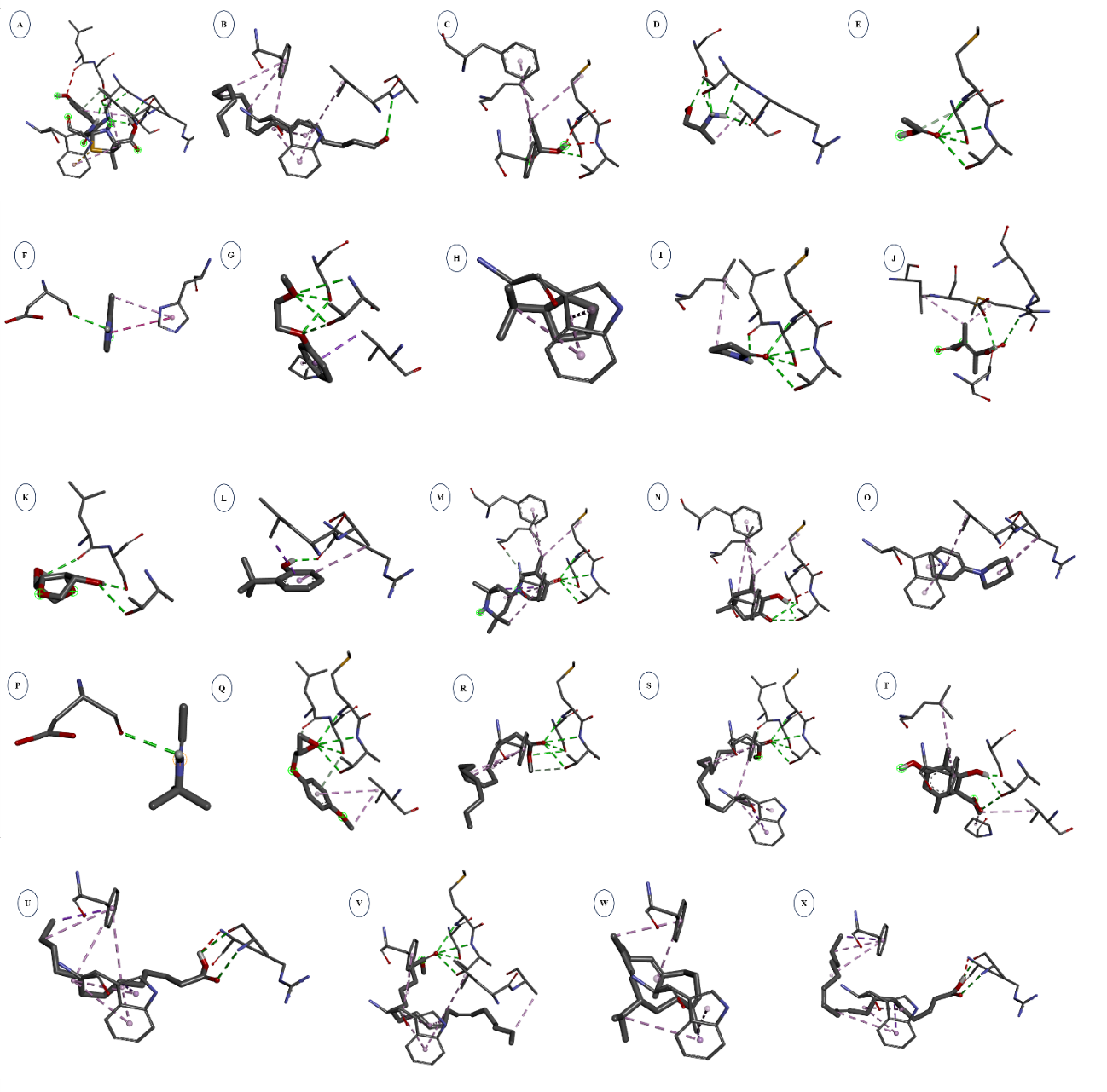 Figure 3 3D interactions of 2-{1-[2-Amino-2-(4-hydroxy-phenyl)-acetylamino]-2-oxo-ethyl}-5,5-dimethyl-thiazolidine-4-carboxylic acid (Control) and bioactive compounds from Coccocarpia erythroxyli (Spreng.) Swinscow & Krog against the 6IE1 protein. (A) 2-{1-[2-Amino-2-(4-hydroxy-phenyl)-acetylamino]-2-oxo-ethyl}-5,5-dimethyl-thiazolidine-4-carboxylic acid; (B) 9-octadecenal, (z)-; (C) Propiolic acid; (D) 2-Propanamine, 1-methoxy-; (E) Ammonium acetate; (F) Pyrazine, methyl-; (G) Benzene, (2-methoxyethoxy)-; (H) Cyclopentane, (1-methylethyl)-; (I) 2-pyrrolidinone; (J) 2,3-Dihydro-3,5-dihydroxy-6-methyl-4H-pyran-4-on; (K) Isosorbide; (L) Phenol, 2-(1,1-dimethylethyl)-; (M) Piperidin-4-one, 3-methyl-1-(2,2,6,6-tetramethyl-4-piperidyl)-; (N) 2-hydroxy-3,5,5-trimethyl-2-cyclohexenone; (O) Piperidine, 1-(1-cyclohexen-1-yl)-; (P) Ethanimine, N-t-butyl-; (Q) P-Methoxyphenyl glycidyl ether; (R) Pentadecanoic acid, methyl ester; (S) Hexadecanoic acid, methyl ester; (T) Benzoic acid, 2,4-dihydroxy-3,6-dimethyl-, methyl ester; (U) Tridecanoic acid; (V) 9,12-Octadecadienoic acid (Z,Z)-, methyl ester; (W) Cembrene; dan (X) 9,12-Octadecadienoic acid (Z,Z)-.