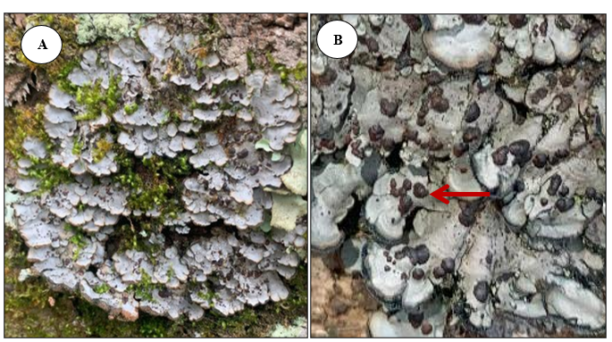 C. erythroxyli (Spreng.) Swinscow & Krog, belonging to the Coccocarpiaceae family, is a corticolous lichen characterized by a foliose thallus that is rounded in shape. The thallus has a smooth texture with uneven edges and does not fully adhere to the substrate. Its underside features rhizines, with thallus lengths ranging from 10 to 35 cm and lobe widths between 0.5 to 1 cm. The upper surface of the thallus is gray, while the underside is black. Reproductive structures consist of rare black apothecia (Figure 1). Chemical tests reveal that the upper cortex reacts K+ (yellow), while it is C- and KC-. This species has been found in Indonesia, specifically in the Batang Toru Forest [16] and Taman Hutan Raya Bukit Barisan in North Sumatra [17]. It thrives in fully lit areas at altitudes of 874 to 903 m above sea level.