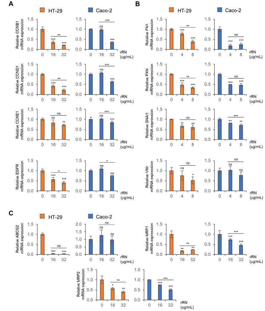 Figure 4 Effect of rRN on cell motility in CRC cell lines. Cell migration assay in HT-29 (A) and Caco-2 (B) cells. Cell invasion assay in HT-29 (C) and Caco-2 (D) cells. (E) Cell viability assay after rRN treatment for 24 h. Significant differences are indicated by **p < 0.01 and *p < 0.001; ns, not significant.