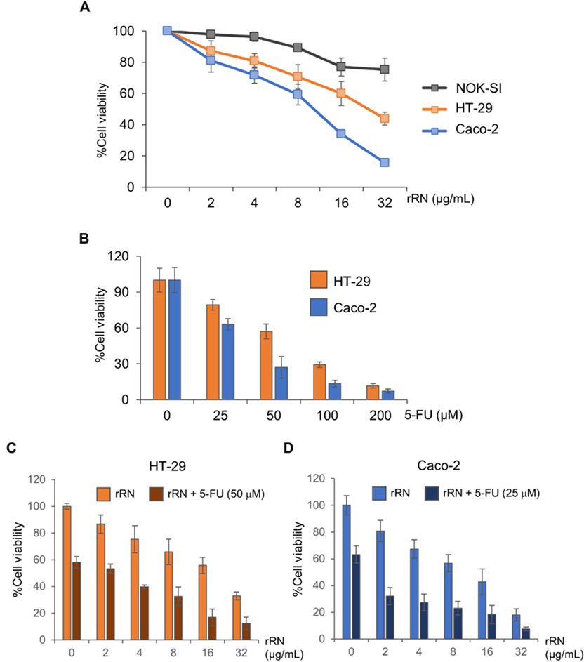 The MTT assay was also applied to determine the effect of combined 5-fluorouracil (5-FU) and rRN treatment. First, HT-29, Caco-2, and NOK-SI cells were treated with various concentrations of 5-FU for 72 h, followed by the MTT assay. The IC50 values were calculated. For the combination treatment, the sub- IC50 concentrations of 5-FU for each cell line were selected. HT-29 and Caco-2 cells were seeded overnight. The following day, cells were treated with various concentrations of rRN alone or combined with sub- IC50 concentrations of 5-FU (50 µM for HT-29 and 25 µM for Caco-2, respectively) for 72 h. These combination treatments were also performed in NOK-SI for comparison. Finally, the MTT assay was then performed to assess cell viability as described above.
