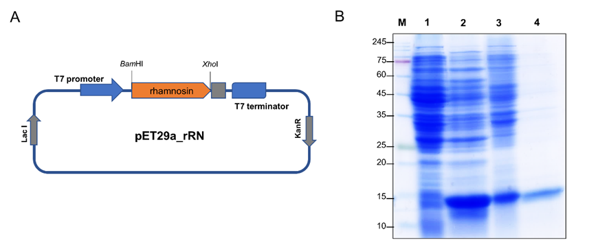 Figure 1 Expression of rRN. (A) pET29a_rRN expression plasmid map. (B) SDS-PAGE analysis. Lane M: Protein molecular weight markers; lane 1: Uninduced bacterial cell lysate; lane 2: Induced cell lysate (soluble fraction); lane 3: Induced cell lysate (insoluble fraction); lane 4: purified recombinant bacteriocin.