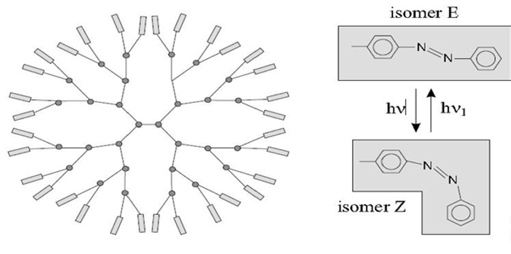 The antennae on dendrimers are made to receive light. Absorption pigments on the outer surface of these dendrimers transport light energy to other pigments in the nucleus [275-279]. The cavity may open or close in response to light from the dendrimer optical receptors, allowing the trapped drug to either be released or absorbed [280-282]. Archut et al. published an example of such optical antennas. Photochemical pore opening occurred in the dendrimer (polypropylene imine with the 32-end group of azobenzene) (Figure 13). This dendrimer’s azobenzene groups can be reversed by optical isomerization. When exposed to 313 nm light, isomer E transforms into Z form; at 254 nm or heat, it reverts to its original isomeroulia, E. These dendrimers can serve as a light-switching host for eosinY, a red crystalline powder with the formula C20H8O5Br4 that is employed in biology to stain cells when combined with sodium or potassium ions. Guest molecules are released as a result of these photochemical alterations on the dendrimers’ surface [283-287].