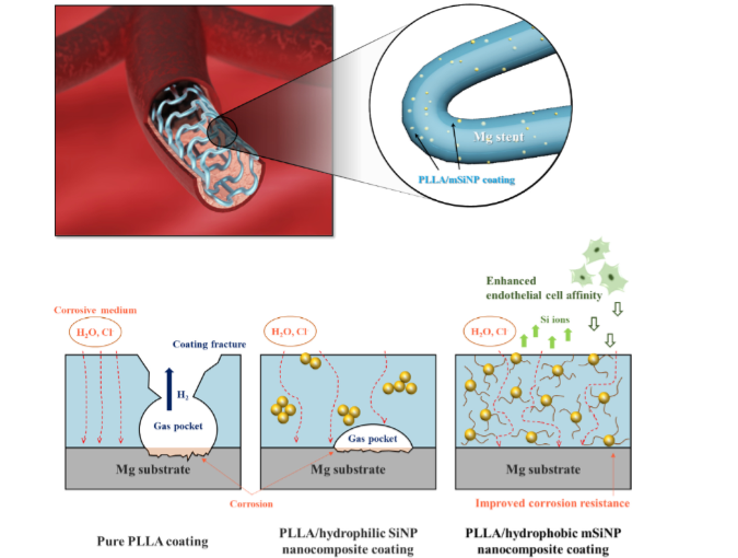 Figure 5 Schematic illustration of bifunctional PLLA/mSiNP nanocomposite coating on the Mg stent surface [55].