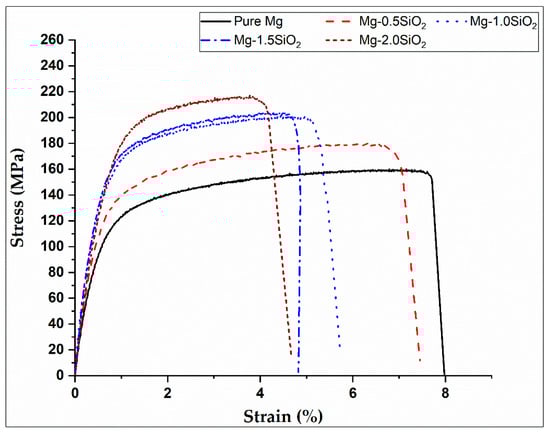 Figure 2 The stress-strain diagrams of Mg and Mg-SiO2 syntactic foams [53].