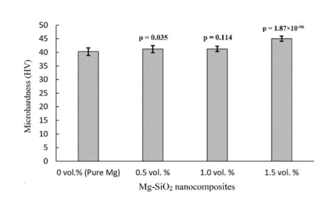 Orthopaedic implants, scaffolds for tissue engineering, and devices for bone restoration are just a few of the biomedical uses that have attracted a lot of interest in silica-based magnesium composites due to their biodegradability, bioactivity, and distinctive mechanical characteristics. The addition of silica to the magnesium reinforcing process improves the mechanical characteristics of these composites. While magnesium is biodegradable and biocompatible, its use in load-bearing applications may be restricted due to its comparatively low mechanical strength. Magnesium alloys are made more stronger, harder, and more fatigue resistant by adding silica, a biocompatible and inflexible substance. Bone implants and other structures that need both structural support and controlled biodegradation might benefit from these materials because of this adjustment, which improves mechanical performance while simultaneously enhancing the materials degradation potential [220,221]. There are many more uses for silica than only mechanical reinforcement. In addition to preventing magnesium from deteriorating too rapidly in the presence of bodily fluids, which may cause problems like gas buildup or uncontrolled ion release, silica is essential for enhancing magnesium’s corrosion resistance. Magnesium composites made of silica reduce magnesium’s corrosion rate, which means the material may sustain healing while still being strong. To ensure the composite integrates into the biological system gradually and to prevent early material failure, controlled degradation is required. Furthermore, bioactive molecule coating and other surface modifications of silica-based magnesium composites are crucial for increasing tissue integration, osteoblast development, and cellular interactions. The regulated release of bioactive ions, such as silicon and magnesium, from these composites makes them even more osteogenic, creating an ideal setting for the regeneration of bone tissue. Biomedical materials’ biocompatibility and performance are greatly impacted by nanoparticles, especially when they are mixed into composites such as silica-based magnesium alloys. The breakdown of biomaterials is an example of a natural process that may introduce nanoparticles into biological systems. Other examples include medical implants, medication delivery systems, and intentionally introduced nanoparticles used in therapeutic applications [68]. Nanoparticles have a wide range of effects on cellular processes, immunological reactions, and tissue integration once they enter the body and begin to interact with biological systems [222,223]. Nanoparticles’ chemical make-up, surface charge, size, and shape all have a role in how cells and tissues absorb them, which in turn determines how they interact with biological systems. Toxic consequences or an enhanced intended biological response are 2 possible outcomes of nanoparticle use. Nanoparticles may enhance cell adhesion, proliferation, and differentiation in silica-based magnesium composites, making the material more bioactive. This is particularly true in bone tissue engineering applications. On the other hand, these nanoparticles might cause harm if they cause inflammation or if their breakdown products build up in tissues. Magnesium composite nanoparticles may cause oxidative stress, interfere with cellular function, or set off immunological responses; these are the main toxicological issues linked with these particles. Size and surface characteristics of nanoparticles affect their ability to be taken up by cells and where they end up in the body, 2 aspects that contribute to nanotoxicity. One example is the fact that nanoparticles with a smaller size have a higher potential for cytotoxicity due to their increased ability to cross biological membranes [224,225]. Furthermore, toxic ions or particles may be released during nanoparticle breakdown, which may have negative impacts on living organisms. An essential component of creating safe and effective biomedical materials is finding a balance between the good benefits of nanoparticles and their possible toxicological hazards. Thus, researchers strive to optimize the nanoparticle features to maximize the material’s therapeutic qualities while limiting the possibility of detrimental effects [69]. As a result, nanotoxicity becomes a critical factor in the biocompatibility of silica-based magnesium composites. Figure 3 shows the microhardness measurements of the prepared nanocomposites. The maximum microhardness was achieved at 1.5 vol % Mg-SiO2 nanocomposite [226-228].
