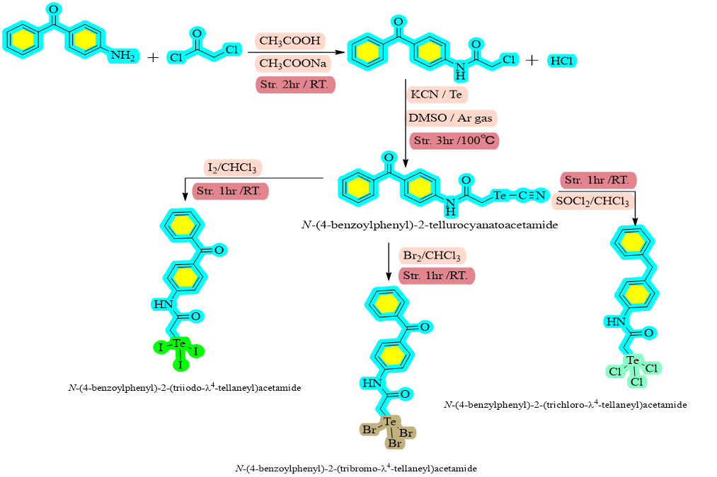 A series of tellurium compounds were prepared based on the N-(4-benzoylphenyl)-2-chloroacetamide (4-CAP), as shown below [31]. As shown in Scheme 1, physical properties shown in Table 1.