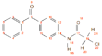 In a round bottom flask, a solution of (10 mmol, 1.97 g) 4-aminobenzophenone (A.B.P) was dissolved in 10 mL of glacial acetic acid (G.A.A) with continuous stirring at room temperature. A solution of (14 mmol, 0.8 mL) Chloroacetylchloride (C.A.C) was gradually added by an addition funnel with continuous stirring for 30 min at room temperature. Then, 10 mL of 0.5 M sodium acetate (5 mmol, 0.41 g) was added dropwise, a precipitate was observed with each drop with continuous stirring for another 30 min at room temperature. Then, white crystals of N-(4-benzoylphenyl)-2-chloroacetamide (C.A.P) was filtered, washed several times with deionized water, dried and recrystallized using absolute ethanol, the purity was monitored by TLC, Rf value = 0.68 (3-n-hexane: 7-ethyl acetate), melting point 123 - 125 °C, yield 87%. FT-IR using KBr: υ (NH) = 3,350 cm–1 [32], υ (C–H) Aromatic = 3,087 cm–1, υ (C–H) Aliphatic = 2,954 cm-1 ,υ (C=O) Ketone = 1,703 cm–1 [33], υ (C=O) Amide = 1,638 cm–1, υ (C=C) Aromatic = 1,596 cm–1, (C–N) = 1,316 cm–1, (C–Cl) = 728 cm–1. 1H-NMR (400 MHz, DMSO-d6) δ H20, H21(4.33ppm, s,2H), Ar-H (7.53 - 781 ppm, m, 9H), H16 (10.71 ppm, s,1H). 13C-NMR (400 MHz, DMSO-d6) at ppm C1 = 44.10, C2 = X, C6 = 137.89, C7 = 132.77, C9 = 143.04, C3 = 16571, C4 = 195.01, C5 = 131.67, C11 = 129.88, C8 = 119.11, C10 = 128.95 as shown in Tables 2 - 4 and Figures 1 - 3 and 8.