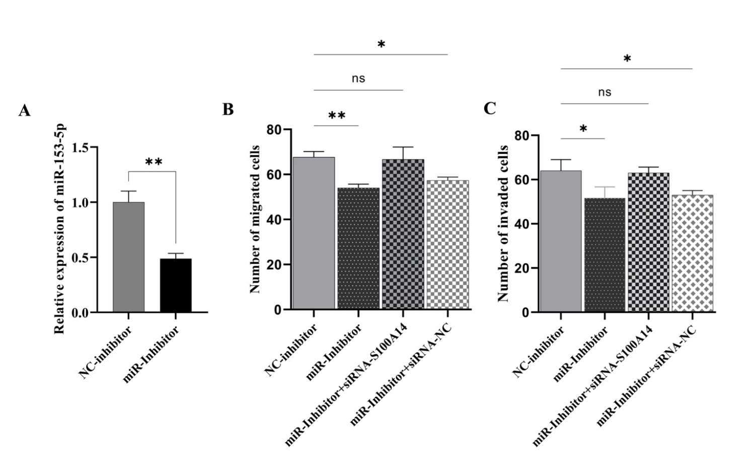 Figure 3 Inhibition of miR-153-5p reduces pancreatic cancer cell migration and invasion. (A) Migration assay showing a significant reduction in migrated cell numbers upon miR-153-5p inhibition, with rescue observed in the miR-153-5p inhibitor + siRNA-S100A14 group. (B) Invasion assay demonstrating decreased invaded cell numbers after miR-153-5p inhibition, which was reversed by siRNA-S100A14. (C) qRT-PCR analysis confirming the successful knockdown of miR-153-5p after transfection with its inhibitor. Data are presented as mean ± SD; *p < 0.05, **p < 0.01 from 3 independent biological replicates (n = 3).